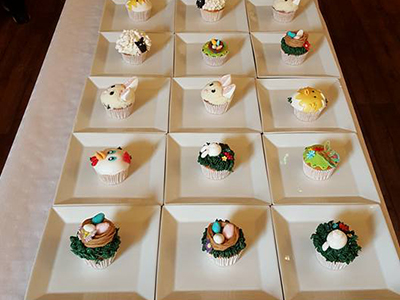 Na de groenteterrine en aspergesoep volgen nog broodjes met diverse beleg en paasbrood. De bijzondere cupcakes, aangeboden door Loluxtaarten, waren een groot succes. De schaapjes, konijntjes, kippetjes en andere vormen waren prachtig gemaakt door Esmeralda Vijfschaft van Loluxtaarten. ‘Zoiets heb ik nog nooit gezien, en nog erg lekker ook”, aldus één van de gasten.